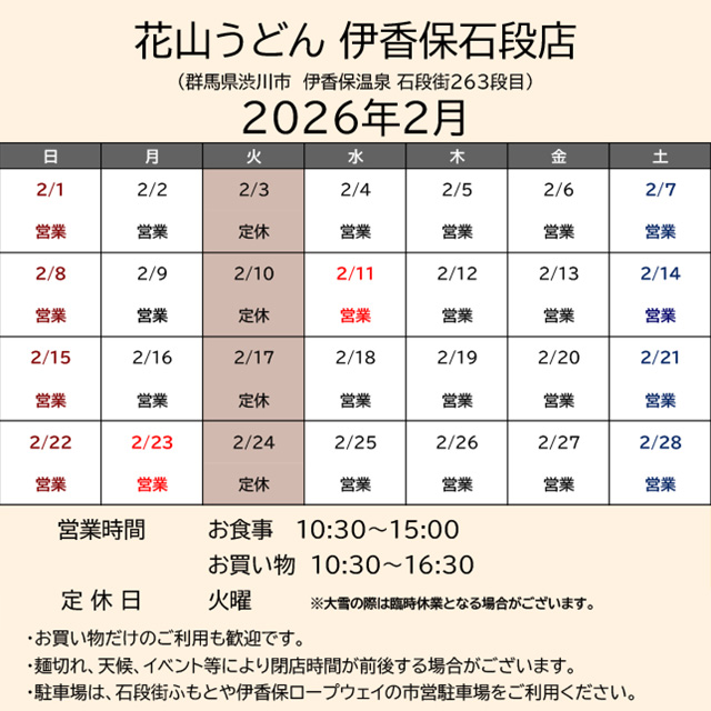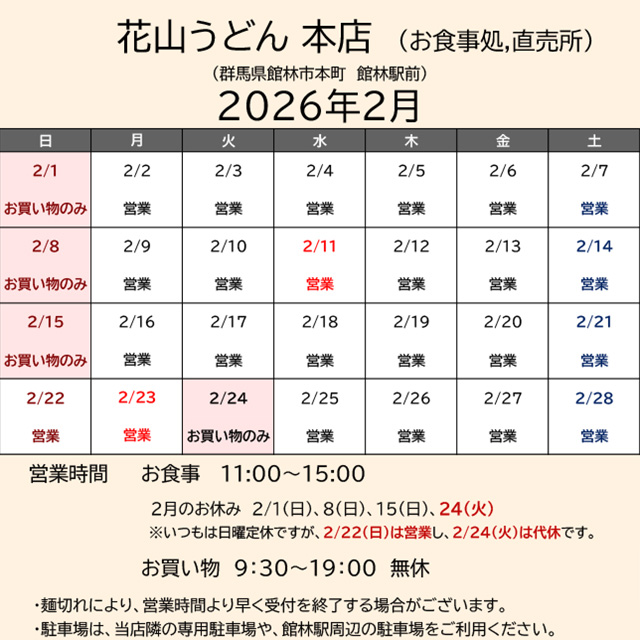 2月のお休み 2/1(日)、8(日)、15(日)、24(火)