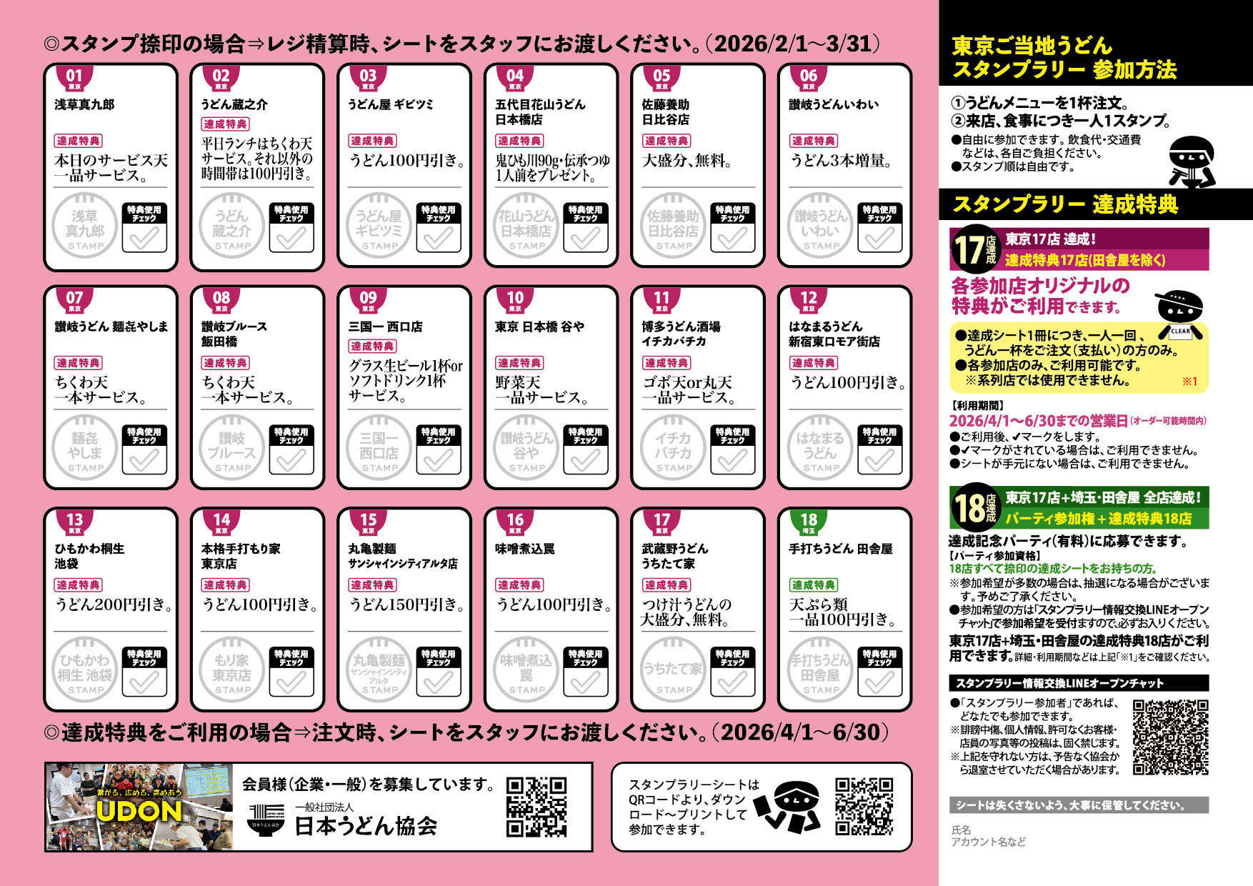 東京ご当地うどんスタンプラリー2026 台紙(クリックで拡大表示になります)