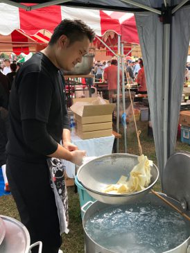 店舗でお食事されるお客様と違い、混雑した会場では受け取ってから召し上がるまで時間がかかります。すぐに召し上がらないので、料理を受け取ってから徐々に余熱で麺が丁度良い硬さになる様、会場の混雑具合に合わせて茹で上げをコントロールしました。全神経を茹でに橋田は集中しておりました!