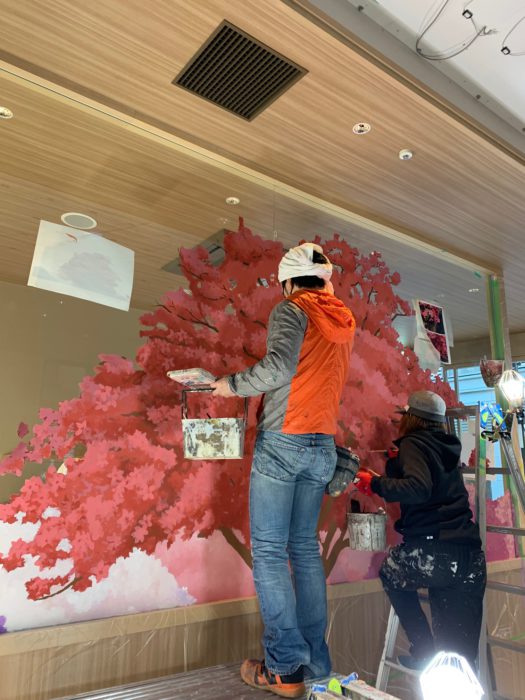 写真は、日本橋店の「ツツジ」壁画制作のようすです。